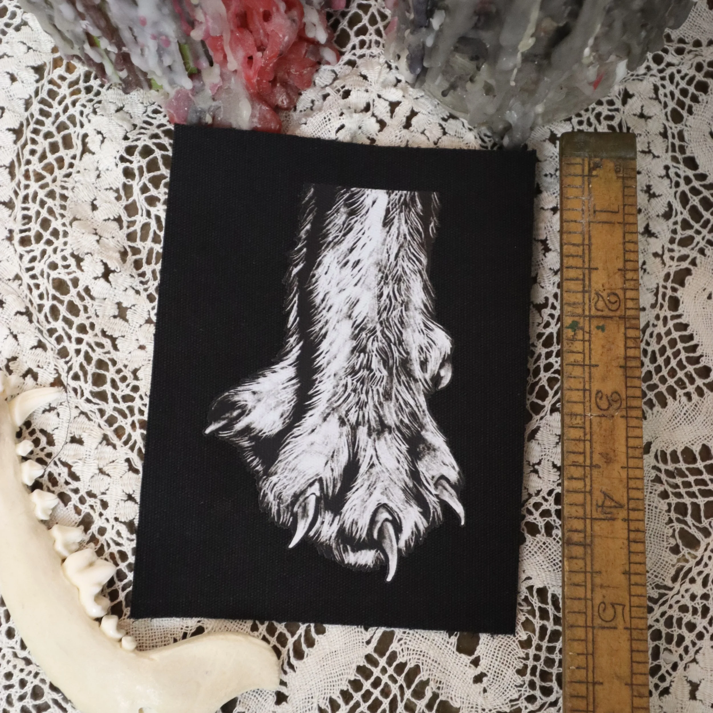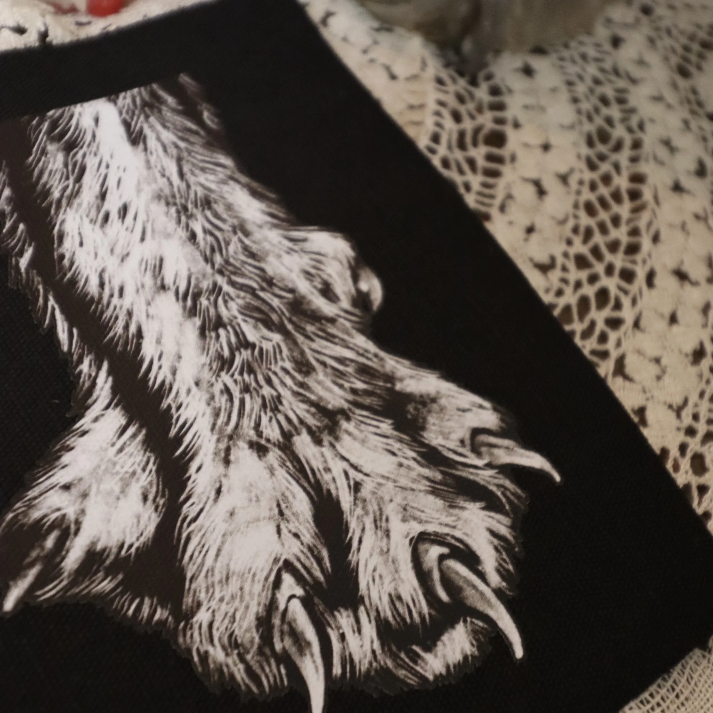 Handmade sew-on patches crafted from thick black canvas, featuring original artwork drawn by me. Perfect for personalising your clothing and accessories. Each patch is hand printed and cut out.